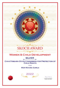 राज्य बाल अधिकार संरक्षण आयोग को स्कोच अवार्ड मिलने की घोषणा ऑनलाइन कार्यक्रम में की गई। इसमें देशभर से कई राज्य शामिल हुए। छत्तीसगढ़ से राज्य बाल अधिकार संरक्षण आयोग की अध्यक्ष श्रीमती तेजकुंवर नेताम, सदस्यगण श्रीमती पुष्पा पाटले, श्रीमती आशा संतोष यादव, श्रीमती संगीता गजभिये, श्री सोनल कुमार गुप्ता, श्री अगस्टीन बर्नाड और सचिव श्री प्रतीक खरे भी कार्यक्रम में शामिल हुए। सभी सदस्यों ने अध्यक्ष श्रीमती नेताम को बधाई दी। इस पर उन्होंने अवार्ड का श्रेय आयोग के सदस्यों के परिश्रम को दिया है।