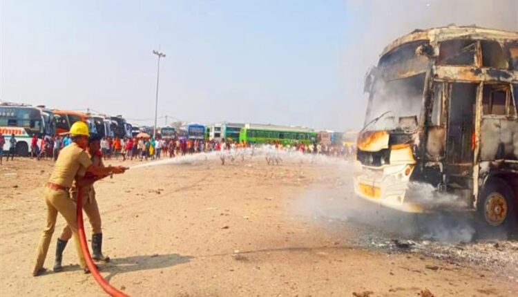 बस स्टैंड पर खड़ी बस में लगी आग, यात्रियों में मची अफरातफरी